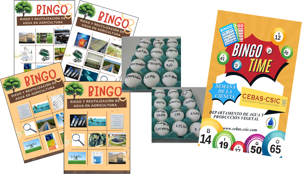 Se llevará a cabo una actividad interactiva. En concreto, un juego didáctico (Bingo) en el que los participantes podrán aprender conocimientos básicos relacionados con el uso del agua y la producción vegetal. En concreto, el juego busca hacer más atractivo el aprendizaje sobre la temática de riego y reutilización de agua en agricultura. Se pretende que los participantes recuerden diferentes conceptos e ideas en un contexto divertido.