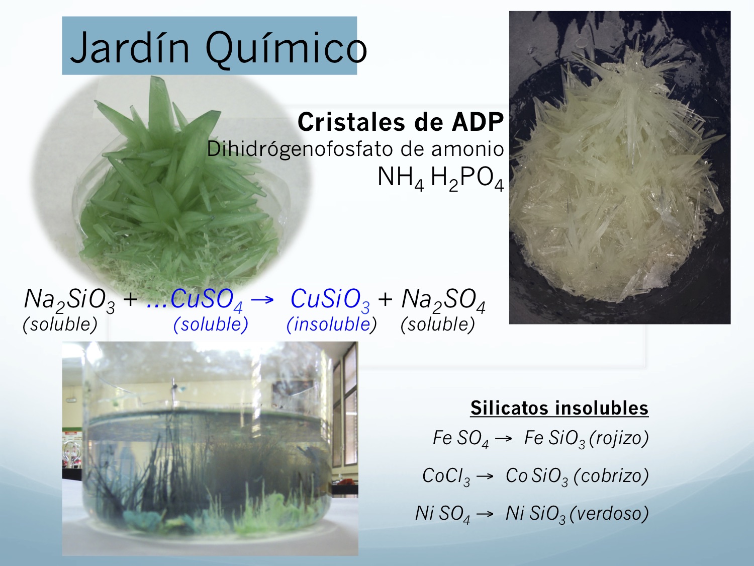 Exposición de cristales de ADP (dihidrogenofosfato de amonio) y de cristales silicatos de metales de transición.