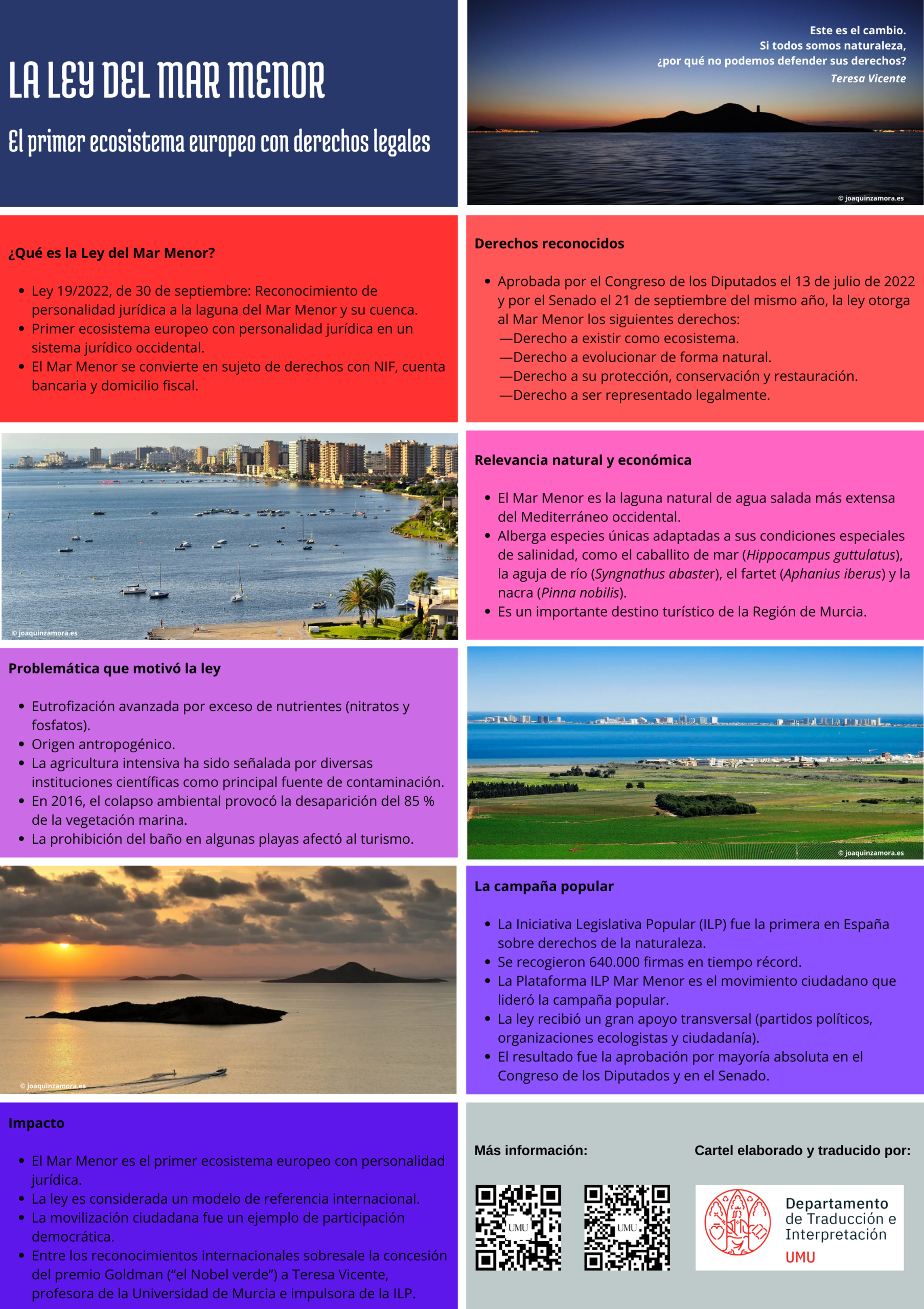 Actividad propuesta por el profesor Juan Goberna con la colaboración de María Ángeles Orts y Nieves Fluet. Esta propuesta utiliza la presentación oral y explicativa de pósteres informativos en formato A1 para divulgar la Ley 19/2022 de Personalidad Jurídica del Mar Menor, que convierte a esta laguna murciana en el primer ecosistema europeo con derechos legales propios. La metodología multilingüe presenta el mismo contenido traducido al español, inglés y francés, las tres lenguas principales del Grado en Traducción e Interpretación de la Universidad de Murcia. Los elementos centrales incluyen el reconocimiento a la profesora Teresa Vicente Giménez como impulsora de la iniciativa y ganadora del Premio Goldman 2024, la histórica campaña ciudadana que recogió 640.000 firmas a través de una Iniciativa Legislativa Popular sin precedentes, y el contexto ambiental que motivó la protección legal tras la pérdida del 85 % de la vegetación marina en 2016. Esta actividad representa un modelo ejemplar de cómo la universidad puede contribuir a la difusión de avances legislativos pioneros, facilitando la comprensión internacional de iniciativas que establecen precedentes mundiales en la protección de ecosistemas y los derechos de la naturaleza.
