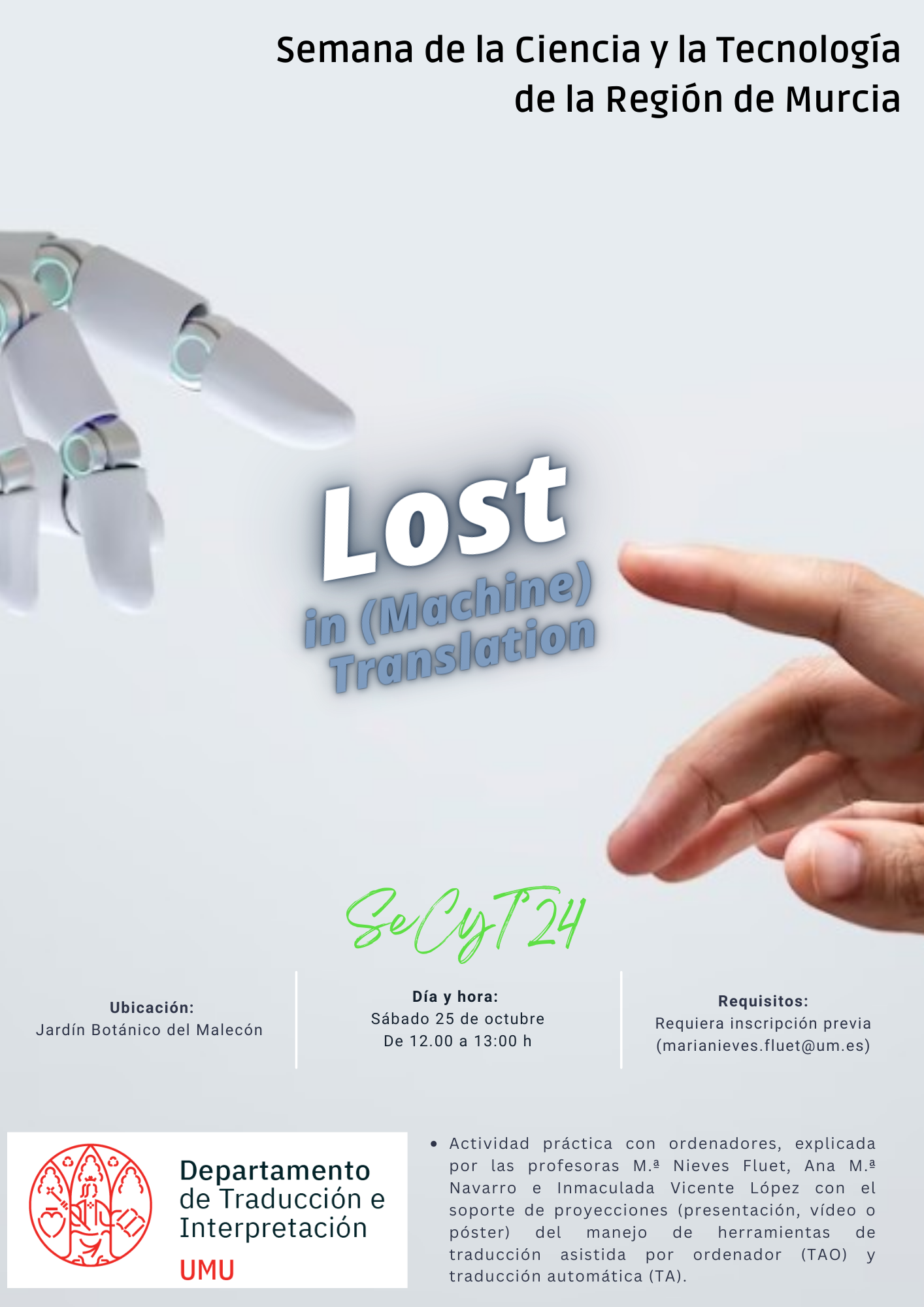 Reserva: Este taller está concebido para un grupo de 8 participantes. Las personas interesadas en participar deberán preinscribirse remitiéndole un correo electrónico a M.ª Nieves Fluet (marianieves.fluet@um.es).