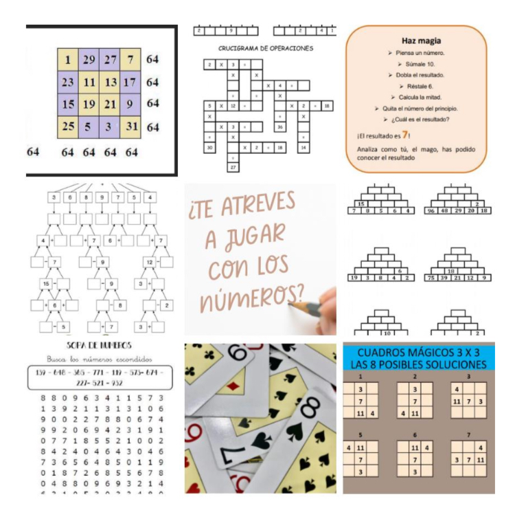 Juegos numéricos en distintas versiones: juegos de cartas, de cálculo mental, cuadrados mágicos, sopas de números, crucigramas matemáticos, juegos de Nim, etc.