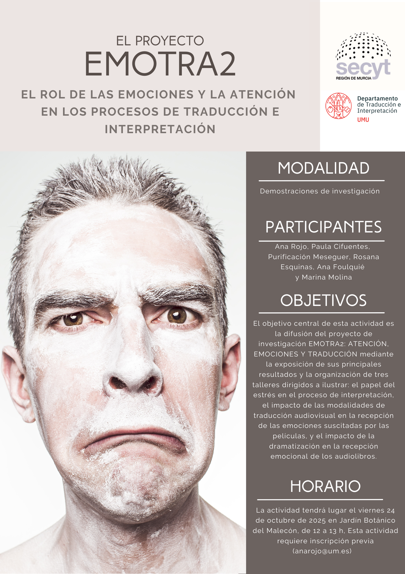 Las investigadoras Ana María Rojo López, Paula Cifuentes Férez, Ana Isabel Foulquié Rubio, Purificación Meseguer Cutillas y Marina Molina Corbalán (colaboradora invitada) han diseñado una actividad con el objetivo principal de difundir los resultados del proyecto de investigación EMOTRA2: ATENCIÓN, EMOCIONES Y TRADUCCIÓN y llevar a cabo tres tipos de talleres dirigidos a ilustrar el papel del estrés en el proceso de interpretación, el impacto de las modalidades de traducción audiovisual en la recepción de las emociones suscitadas por las películas y el impacto de la dramatización en la recepción emocional de los audiolibros: