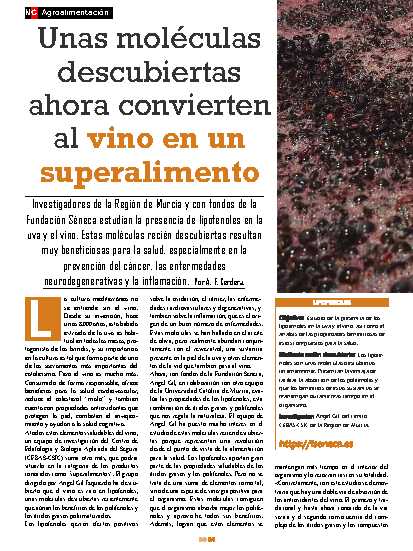 Investigadores de la R. de Murcia y con fondos de la F. Séneca estudian la presencia de lipofenoles en la uva y el vino. Estas moléculas descubiertas resultan muy beneficiosas para la salud, especialmente en la prevención del cáncer, enfermedades neurodegenerativas y la inflamación